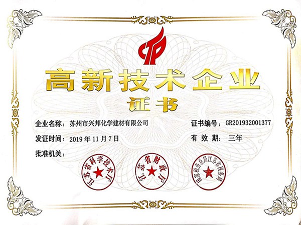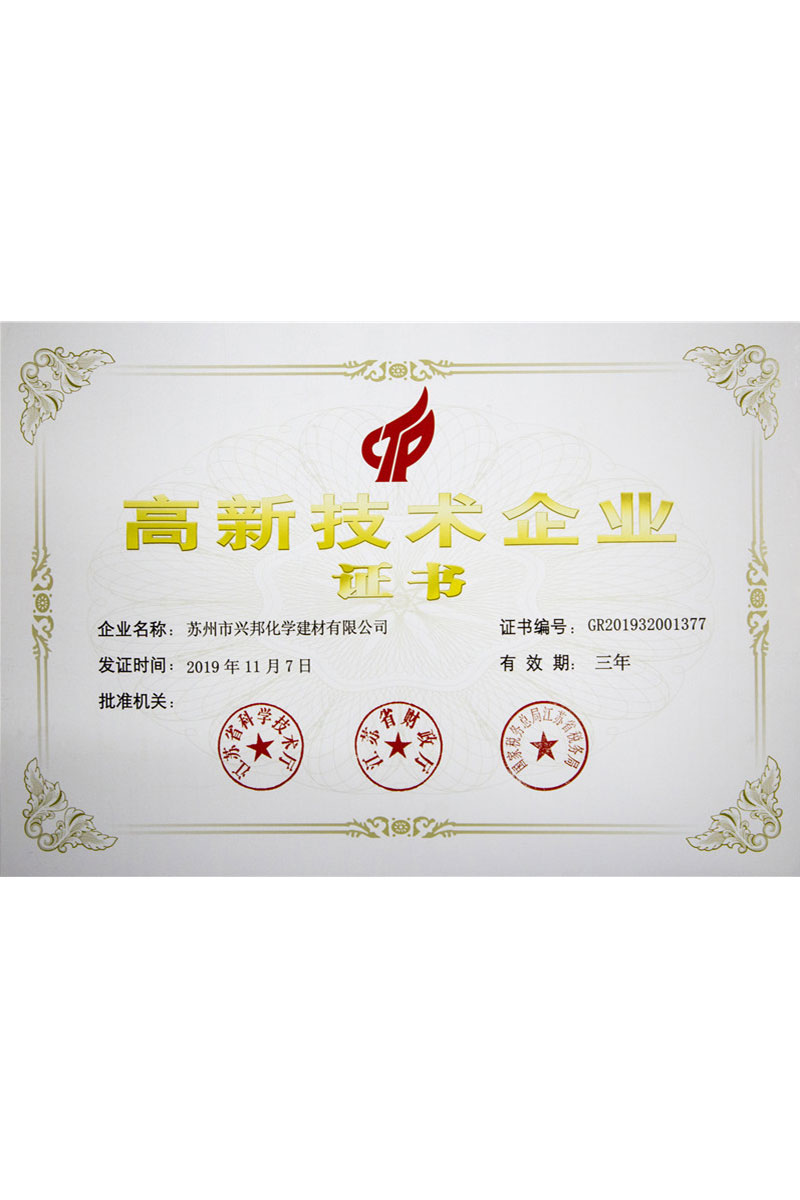 興邦擁有經驗豐富的高水平科研技術團隊,完整的科研管理體系,及完善的科研測試硬件設備。良好的軟硬件條件和持續的科研投入帶來累累碩果,興邦產品和為客戶提供的配方開發支持獲得客戶一致好評,累計獲得授權的發明專利超13件、實用新型超4件,累計參與國家、行業及團體標準超20項。與此同時,興邦自2016年被首次認定為高新技術企業以來,已經連續三次順利通過高企審核。公司技術研發中心被認定為“蘇州市綠色節能建筑材料工程技術研究中心”、“蘇州市企業技術中心”、“江蘇省無機膠凝材料外加劑工程技術研究中心”等等。